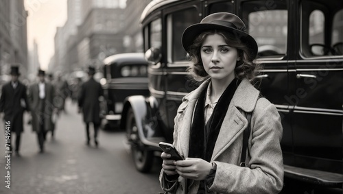 © AKA SUU , Naklejka premium A woman holding a mobile phone, New York, 1875