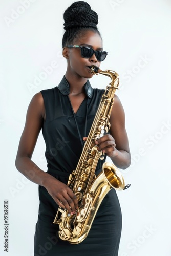 © Fotograf, Obraz premium A woman in a black dress holds a saxophone, perfect for music-related use or as a symbol of creativity