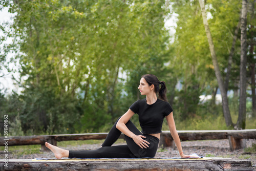 © Lema-lisa, Fototapeta premium a woman in a black suit does yoga in nature