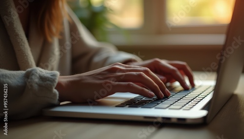 © umut hasanoglu, Fototapeta premium A woman in a cozy robe types on a laptop in a warmly lit room, her hands poised over the keyboard.