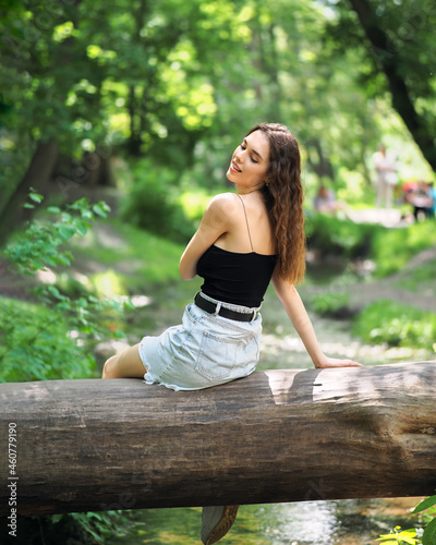 © Sergii Mironenko, Naklejka premium A woman in a denim skirt and a top is sitting on a log in the forest