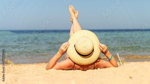 Fototapeta premium A woman in a hat is dried up on the beach