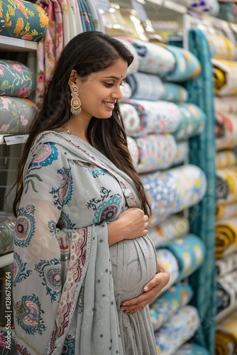 © dyshlivenko, Fototapeta premium A woman in a light grey outfit gently touches her baby bump while exploring vibrant textiles in a shop. The store is filled with various patterned fabrics showcasing rich colors