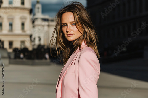 Fototapeta premium a woman in a pink blazer standing alone in a city square