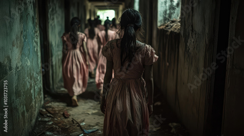 © Kanyanat, Naklejka premium A woman in a pink dress walks down a hallway
