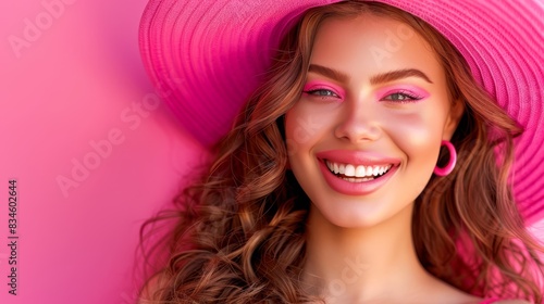 © Mikus, Fototapeta premium A woman in a pink hat and pink dress smiles at the camera