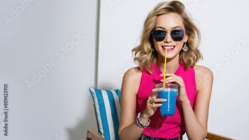 © starush, Obraz premium A woman in a pink shirt drinking from a straw, AI