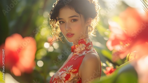 © suriya, Fototapeta premium A woman in a red and gold floral silk dress with a delicate floral shoulder cloth stands amidst a Thai flower garden