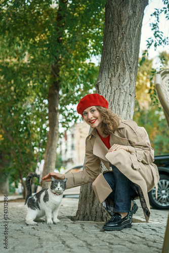 © Cavan, Obraz premium A woman in a red beret caresses a cat on the street. Casual style.