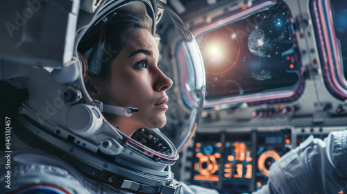© Formoney, Fototapeta premium A woman in a space suit is looking out the window of a spacecraft