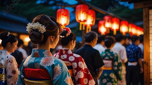 Fototapeta premium A Woman in a Traditional Yukata at a Vibrant Japanese Festival, Embracing Local Heritage and Tourism.