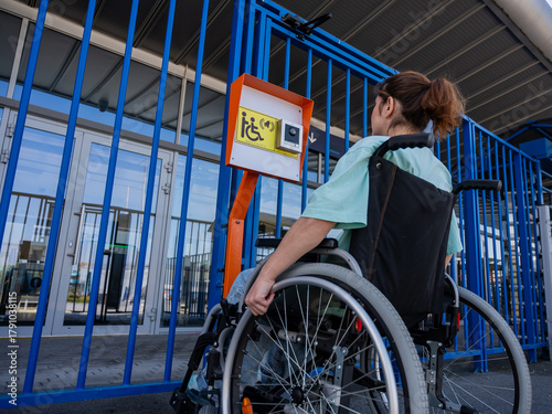 © Михаил Решетников, Obraz premium A woman in a wheelchair uses a touch-sensitive Braille help button..