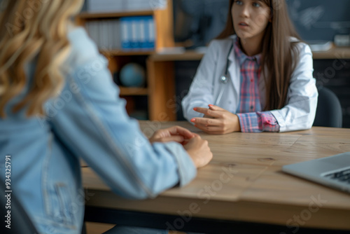 © Formoney, Fototapeta premium A woman in a white coat is talking to another woman in a blue jacket