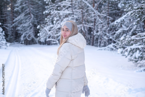 © Viktoriia, Obraz premium A woman in a white jacket and hat standing in the snow