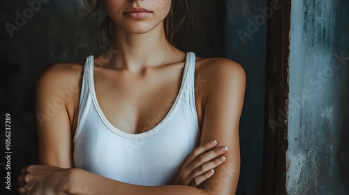 © bvbflo1, Obraz premium A woman in a white tank top with her arms crossed