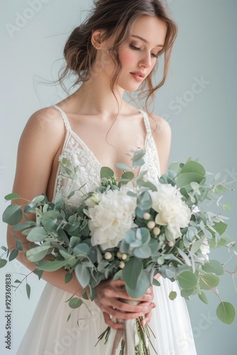 © Fotograf, Naklejka premium A woman in a white wedding dress holds a bouquet of flowers, perfect for wedding or anniversary celebrations