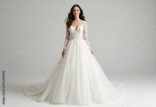 © Vibudhaart, Fototapeta premium A woman in a white wedding dress with a long train lace sleeves and a plunging neckline.