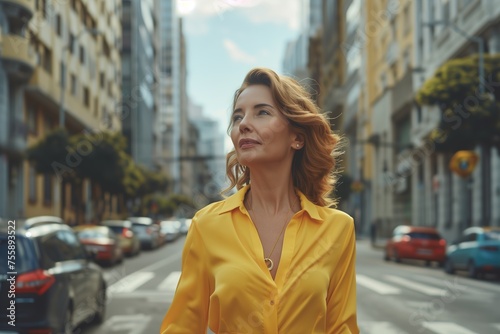 Fototapeta premium A woman in a yellow shirt is walking down a city street