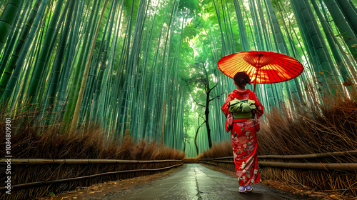 Obraz premium A Woman in Traditional Japanese Clothing Walks Through a Dense Bamboo Forest, Holding a Red Umbrella in a Serene and Tranquil Setting