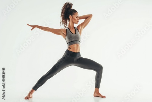 © Ruslan Gilmanshin, Obraz premium A woman in white pants and a matching top is doing yoga