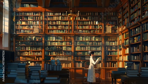 © Kadang Kesel, Fototapeta premium A woman in white stands in a library filled with bookshelves