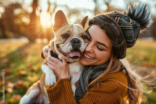 Obraz premium A woman in winter clothing enchants with her smile while cuddling her French bulldog in the park
