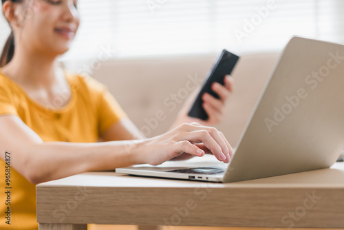 Fototapeta premium A woman in yellow shirt is using laptop while holding smartphone, showcasing...