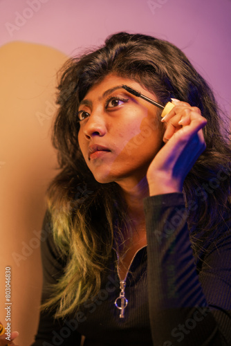 © oybekostanov, Obraz premium A woman is applying makeup, specifically mascara, to her eyes
