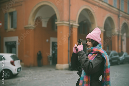 © teksomolika, Fototapeta premium A woman is carefully taking a picture of a building using a camera