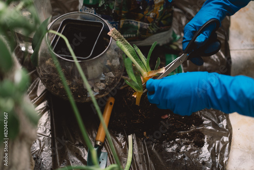 © Анастасія Стягайло, Obraz premium A woman is carefully transplanting a houseplant into a new pot, wearing vibrant blue gloves to keep their hands clean. Gardening tools and a pot with a plant, indicating indoor gardening