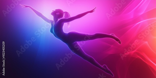 Fototapeta premium A woman is flying through the air in a colorful background. The image has a...