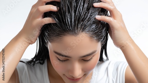 Naklejka premium A woman is gently washing her hair with shampoo, focusing on massaging the...
