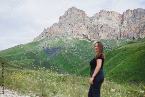 © Northern life, Naklejka premium A woman is gracefully standing in a lush green field, with a majestic mountain prominently rising in the background under a clear sky