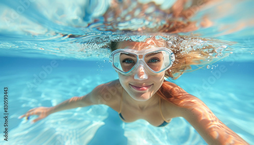 Fototapeta premium A woman is happily submerged in a swimming pool, wearing headgear and taking...