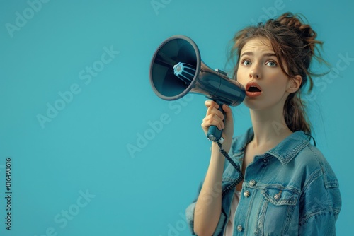 © sornthanashatr, Naklejka premium A woman is holding a microphone and making a loud noise