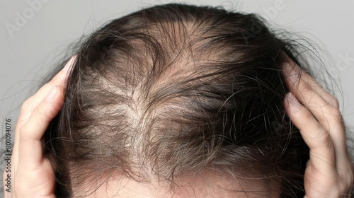 Obraz premium A woman is holding her head in her hands and showing her hair loss.