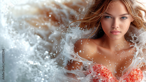 © Bonya Sharp Claw, Obraz premium A woman is in a pool of water, with her hair wet and her face showing. Scene is playful and fun