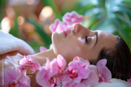© Kaplitskaya Love, Obraz premium A woman is laying on a bed with a bunch of pink flowers on her head