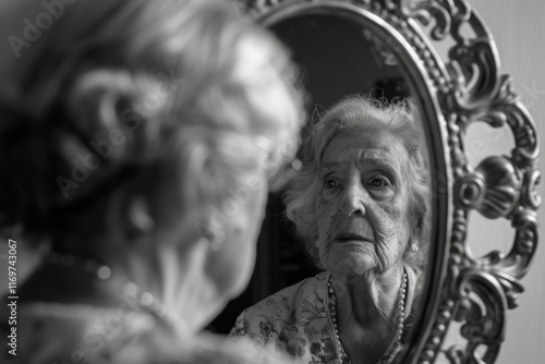 © Andrei, Fototapeta premium A woman is looking at her reflection in a mirror