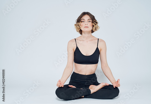 Fototapeta premium A woman is meditating with her legs crossed on the floor on a light background
