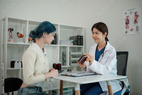 © Treerat, Fototapeta premium A woman is sitting at a desk with a doctor