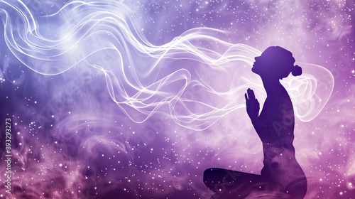 © Nathamanee, Naklejka premium A woman is sitting in a purple background with smoke and stars