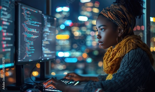 © ekhtiar, Obraz premium A woman is sitting in front of two computer monitors