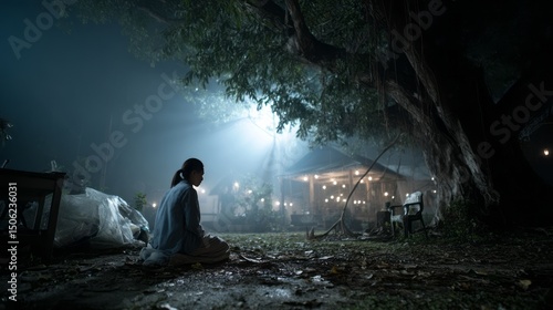 © THESUN, Obraz premium a woman is sitting in garden at night.