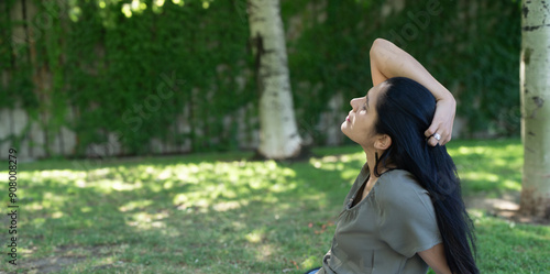 © DANILO, Naklejka premium A woman is sitting in the grass and looking up at the sky