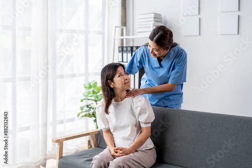 © Wasana, Fototapeta premium A woman is sitting on a couch while a nurse is giving her a massage