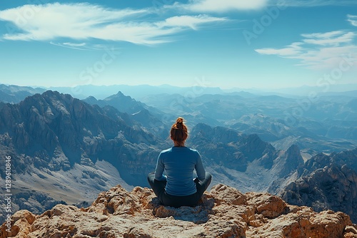 © Ardhana, Naklejka premium A woman is sitting on a mountain overlooking the landscape