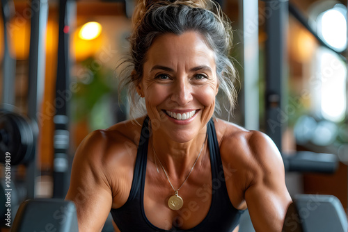© Jati, Obraz premium A woman is smiling and wearing a necklace while exercising