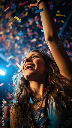 © cff999, Fototapeta premium a woman is smiling while holding up confetti