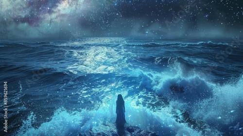 © Sunijsa, Fototapeta premium A woman is standing on a rocky shoreline in the ocean